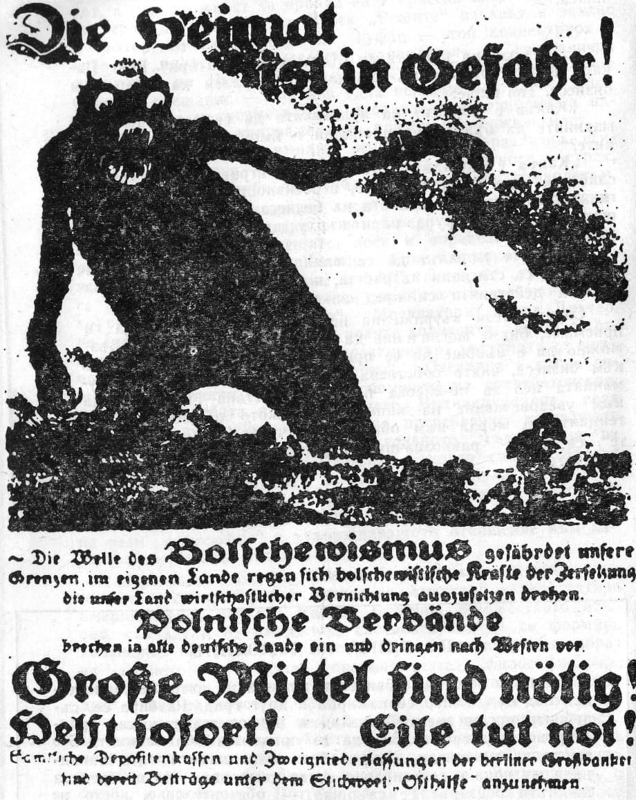 „Отечеството е в опасност!“, крещи с огромни черни букви един плакат от това време, отпечатан с разрешение на правителството в Германския райх. „Вълната на болшевизма застрашава нашите граници, болшевишкиге сили на разрухата разтърсват собствената си страна, те ще подложат на икономическо унищожение и нашата страна. Нужни са огромни средства! Помогнете веднага!“ Отдолу с дребни букви се обяснява: „Всички спестовни каси и филиали на големите берлински банки ще приемат вноските с кодово обозначение: „източна помощ“.