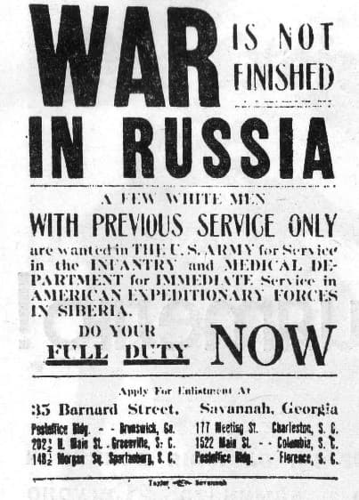 „Войната в Русия продължава. Бели мъже, военно обучени, се търсят от армията на САЩ за пехотните и санитарните части на американския експедиционен корпус в Сибир. Изпълни веднага дълга си! Плакат в САЩ 1919 година.