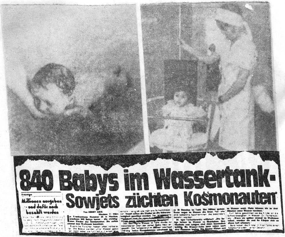 • „840 бебета в цистерни — Съветите отглеждат космонавти“. Под това заглавие Шпрингеровият „Билдцайтунг“ от 21 март 1980 година съобщава, че в Съветския съюз отглеждали бебета в цистерни с вода. Един ден, когато пораснели, тези бебета щели „да бъдат пратени да завладеят космоса“. Западногерманският журналист Хуберт Кушник, като прочел статията, отишъл на посочения адрес в Москва и открил, че там се намира 68-ма московска болница. Там имало 150 бебета с вродени дефекти, поради което се налагало всеки ден да им се прави воден масаж с терапевтична цел.