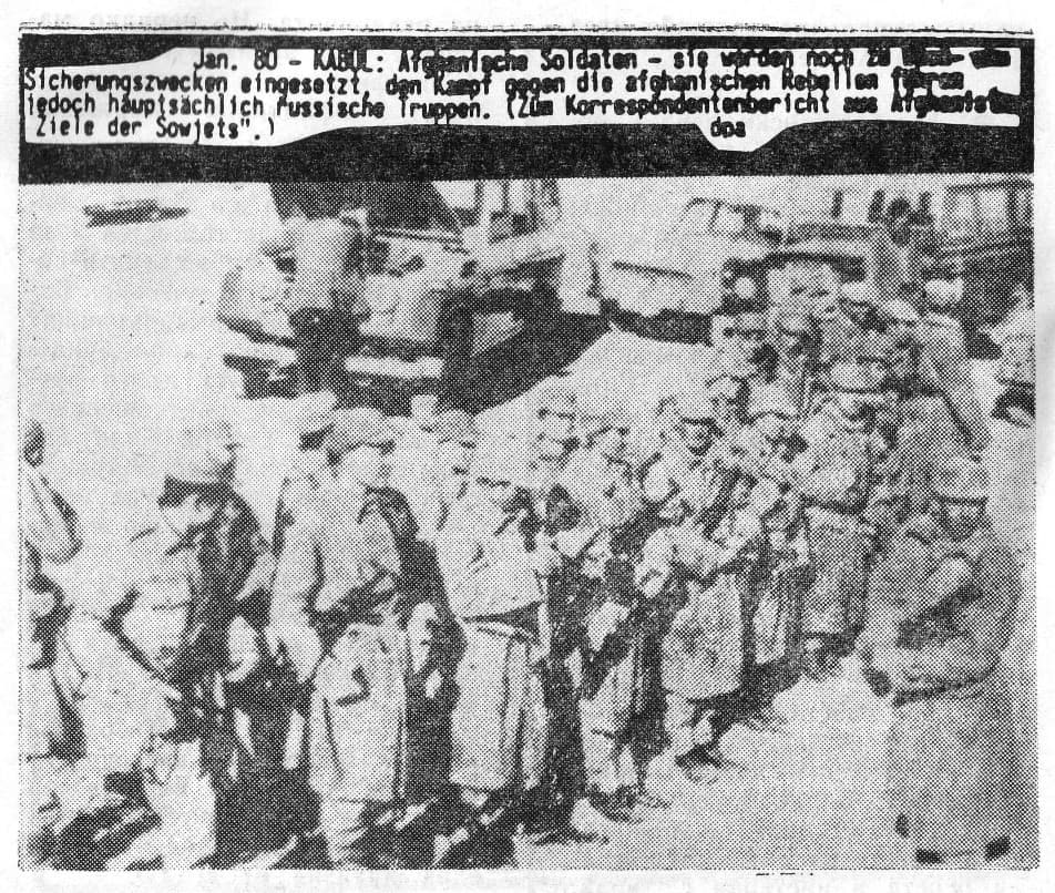Над снимка, разпространена през януари 1980 година в западния печат, показваща само афганистански войници, се казва: „С афганистанските бунтовници се сражават изключително съветски части".
