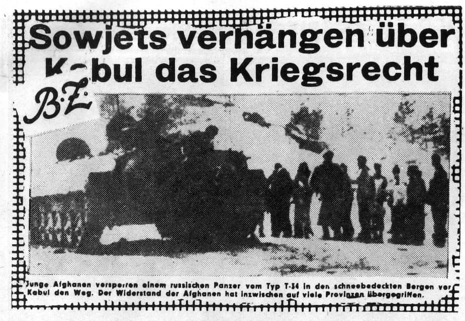 Асошиейтед прес разпространи тази снимка с текст: „Афганистански младежи разговарят със съветски войници и им предлагат цигари. Към същата снимка „Билдцайтунг“ обявява: „Млади афганистанци препречват пътя на един руски танк Т-34 в покритите със сняг планини пред Кабул".