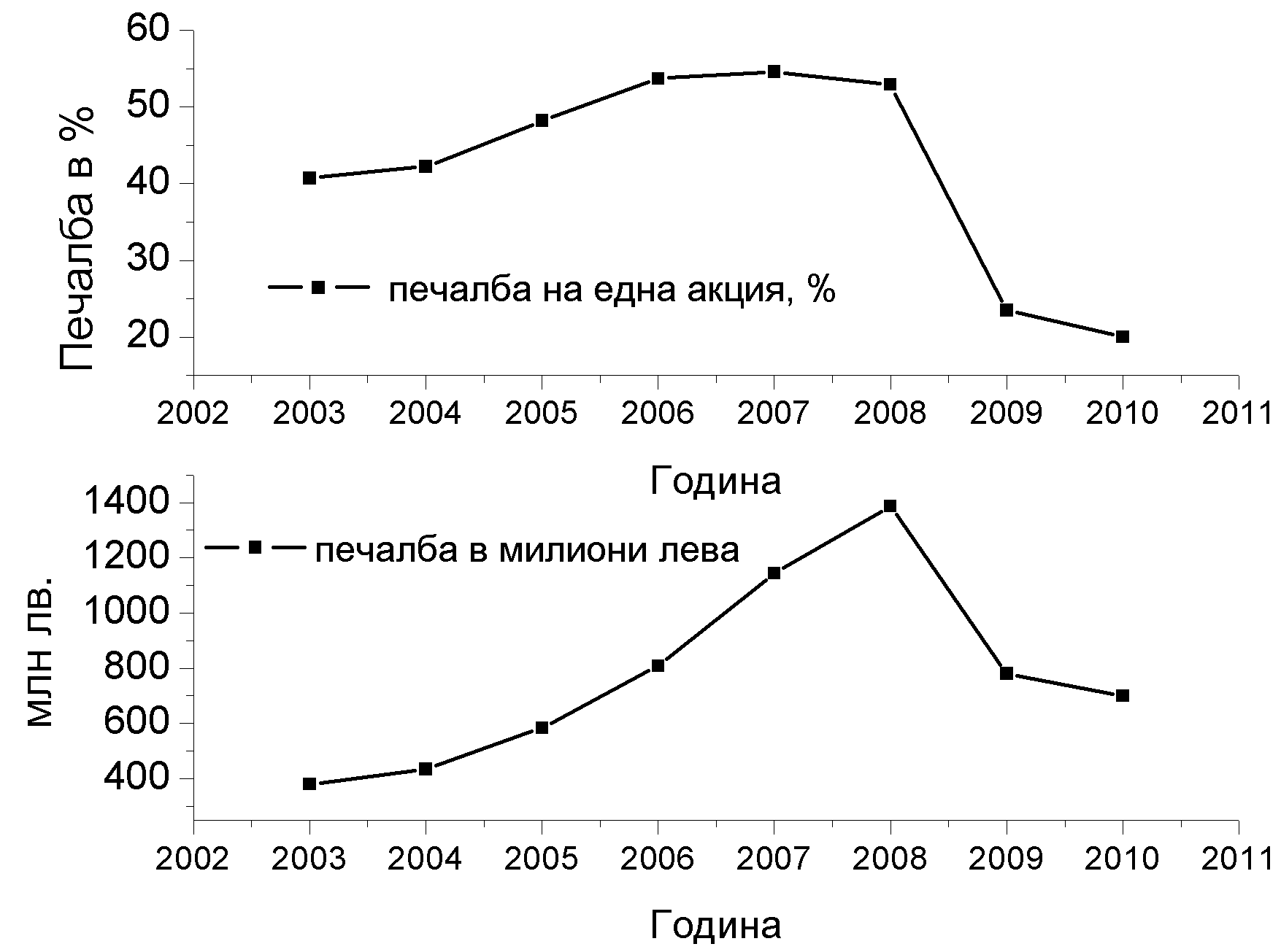 Фигура 1 Абсолютна и относителна печалба на банките от 2003 година насам.