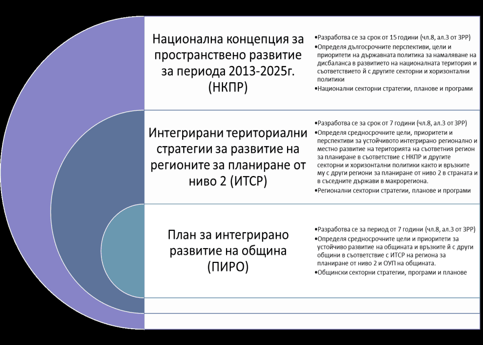 “Съгласно ЗРР Плановете за интегрирано развитие на община са част от системата от документи за стратегическо планиране на регионалното и пространственото развитие. Те са в йерархична съподчиненост на документите от по-горните нива – интегрирани териториални стратегии за развитие на регионите за планиране от ниво 2 и актуализираната Национална концепция за регионално и пространствено развитие (НКПР). Действащото законодателство изисква осигуряването на съгласуваност на ПИРО с основните стратегически документи на европейско, национално и регионално ниво. Стратегическата рамка на ПИРО е фокусирана върху действащите към момента национални и регионални стратегически документи, които акумулират европейските политики.” (2)