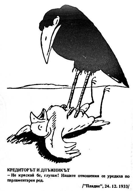 Външният дълг е другата сериозна грешка на българските управници. Неговото изплащане е постоянен проблем в довоенната икономика на България. Лихвата по този дълг е онази част от създаденото в България, която би могла да остане и да се натрупва като национален капитал. Освен това, както и след 1989 година, чуждият дълг идва с условия за изменения в икономическата политика на страната, които на думи трябва да подобрят икономическото състояние на длъжника, но на практика водят до точно обратното.