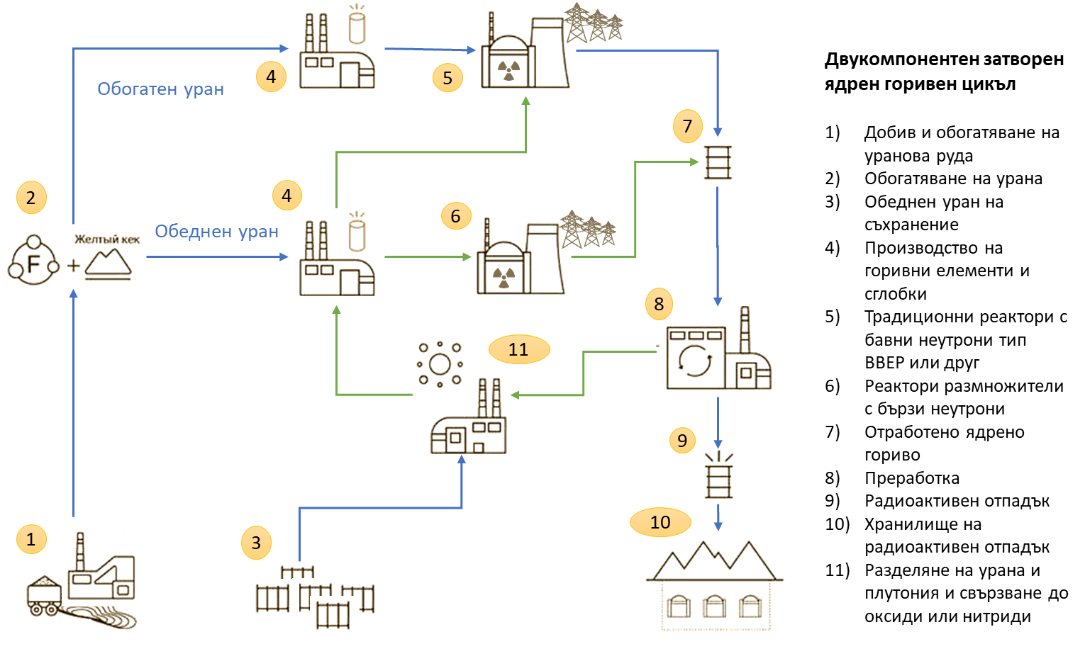 Схема на двукомпонентен затворен ядрен горивен цикъл.