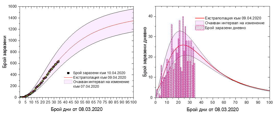 От Фигура 1 следва, че пикът с най-много заразени за ден е преминал 24±3 дни след 8 март или между 29 март и 4 април. Момента, в който ще бъдат заразени половината от всички които ще се заразят, е 36±2 дни след 8 март или между 11 и 13 април. Всички, които ще се заразят и ще бъдат хванати от ген. Мутафчиев ще са между 1200 и 1500 души. Този брои обаче ще се постигне след повече от 200 дни и то ако лятото не промени съществено схемата на заразяване. А то най-вероятно ще я промени и броят заразявани за ден ще спада по-бързо от показаното на дясната графика на Фигура 1. Иначе тя показва, че към 13 май, когато изтича извънредното положение, т.е. около 66-тия ден, ще се регистрират по около 10 души дневно, а след още един месец, т.е. около средата на юни по около 5 души дневно. Нещата обаче може да се изменят в лоша посока, ако хората се отпуснат по Великден.