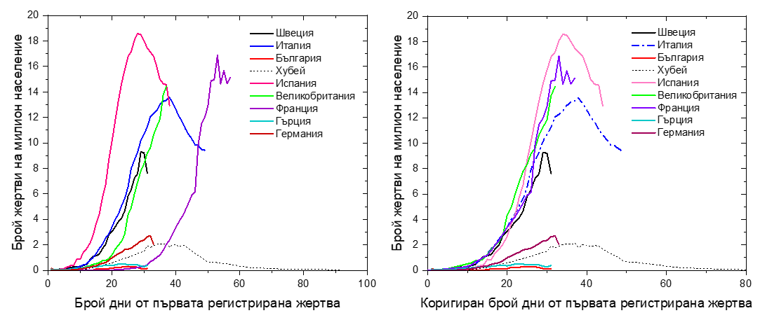 Следващото което трябва да се коригира е началната точка. От вируса умират предимно хора с определени рискови заболявания. Представете си, че във Италия един от първите заразени е точно такъв старец. Той ще почине, както се казва, веднага. А във Франция се заразяват предимно млади и здрави и дълго време след разпространението на вируса жертва няма. Затова е редно да не се разчита на първата смърт като за начало за анализ на данните. Така на дясната графика няколко от кривите за Испания, Великобритания и Франция са преместени с 6, -5 и -20 дни съответно. Така се вижда, че общата функция вече е очертана. Така може да се мисли, че мерките предприети от Испания са най-неефективни, а тези взети от България – най-ефективни. Вижда се и друго, поне към днешен ден (12 април) данните за Швеция се отличават от групата на Италия, Испания и Великобритания единствено по това, че разпространението на епидемията е в по-начален стадий. Това поражда съмнение в ефективността на противовирусните мерки на Испания, Италия и Великобритания.