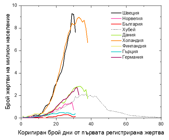 На Фигура 3 са дадени броят жертви на ден за няколко страни, като за начало на хоризонталната ос е взета първата докладвана жертва на вируса. За да се отчете различния размер на страните по вертикала са нанесени броя жертви на милион души. Това представяне отново е приблизително, тъй като заразата е неравномерно разпределена по територията на страната. Пример е Китай в който голяма част от населението не се зарази. Затова броят жертви на милион души за Китай ще е силно занижен. Затова вместо на населението на Китай съм разделил на населението на провинция Хубей, където са преобладаващото число починали. Същата логика може да се приложи и за Италия, в чиято северна част е концентрирана заразата. Така данните за Италия може би също са леко занижени. Ако трябва да се отчита правилно, жертвите и населението трябва да се отчитат по градове и паланки и да се включват само райони с поне един починал от коронавирус.