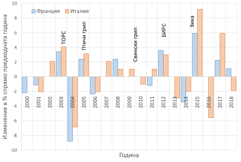 Отговор дава Фигура 2, на която са нанесени измененията спрямо предходна година в проценти на смъртността във Франция и Италия (8). Както се вижда, годишно увеличение на смъртността от 4-6% не е необичайно. В Италия през 2015 година дори има над 9% увеличение на смъртността. Данните за Франция и Италия определено са свързани, както се казва – корелирани. Затова потърсих дали в годините на съвместно увеличение на смъртността не е имало световна пандемия. Данни се откриват във Википедия (9) и се оказва, че връзка има. През 2003 върлува Тежкият остър респираторен синдром (ТОРС) (Severe acute respiratory syndrome, SARS), който също е коронавирус (SARS-CoV). Следващото значително увеличение на смъртността е през 2012 година. Тогава върлува Близко-източният респираторен синдром (БИРС) (Middle East respiratory syndrome, MERS) който също е коронавирус (MERS-CoV). Най-смъртоносен се оказва вирусът Зика (Zika, ZIKV) през 2015, който не е коронавирус. Ако оценките по данните за смъртността се окажат верни, то Зика ще излезе по-смъртоносен от SARS-CoV-2. Но не си спомням нито през 2003, нито през 2012 нито през 2015 да е имало масова паника със затваряне на училища, градове, надомна работа и прочее. Нещо повече, въобще не си спомням да съм чувал за БИРС и Зика. За ТОРС някакъв спомен имам. Но най-добре помня свинския грип (H1N1/09) и птичия грип (H5N1). За тях съм писал, че са измама в полза на компанията собственик на лиценза за Тамифлу, в която дял имаше американския Секретар по отбраната по това време Доналд Ръмсфелд, който при това не се отказа от дела си въпреки изискването на закона (10). Птичият грип не съществува в списъка на Википедия, но попада много добре в общата схема. Свинският грип обаче не е предизвикал никакво увеличение на смъртността нито във Франция нито в Италия. Нека мислим, че не е бил измама, а че Тамифлу-то е дало ефект.
