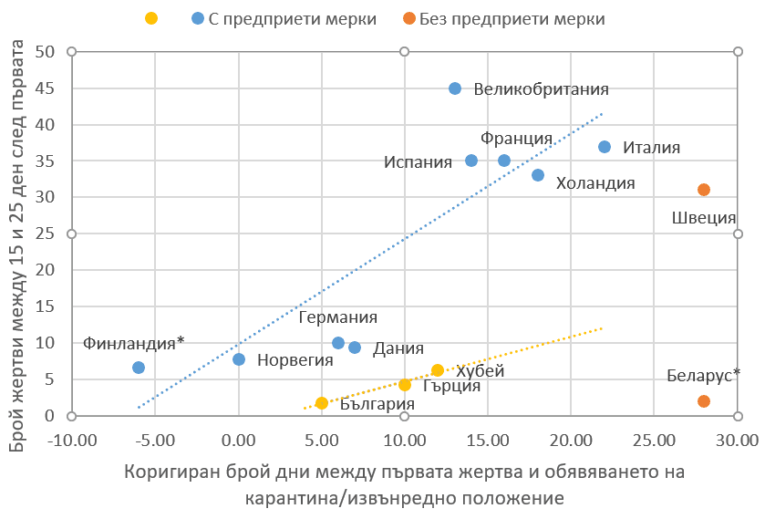 България, Гърция, Хубей и Беларус обаче не попадат в тази схема. Вярно България, Гърция, Хубей обявяват рестриктивните мерки преди 13-тия ден от първата смърт, но броят починали е забележително нисък, включително за Беларус. Беларус не въведе карантина, а само контрол на влизащите в страната, но двете с Швеция се разделят на две групи подобно на останалите 8 страни, което навежда на мисълта, че разликата не е само в момента на въвеждане на противовирусните мерки. От друга страна България, Гърция, Хубей самостоятелно показват зависимост от началото на въвеждане на мерките.