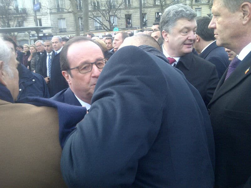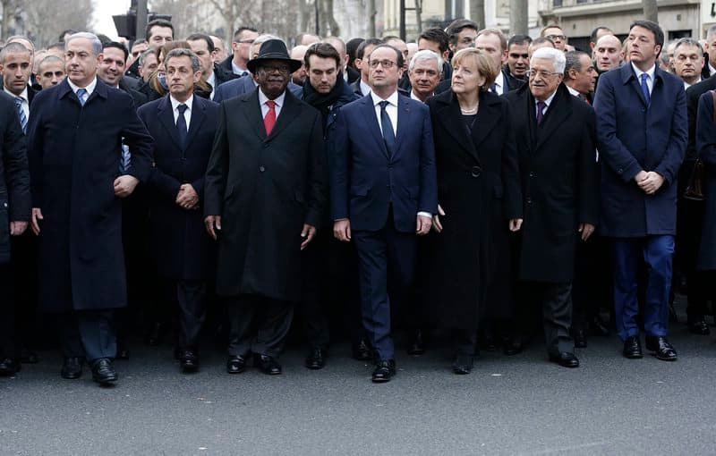 Държавни глави на парижкото шествие на лицемерието. На първа линия в ляво: Натеняху и Саркози. Единия редовно бомбардира Палестина, а другия срина Либия.