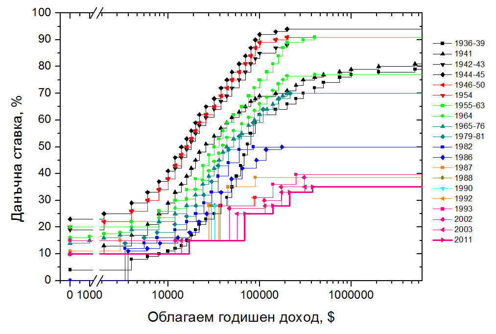 - Друг начин държавата да ограничи разслоението по доходи са данъците и социалните разходи, т.е. вземането от богатите и даването на бедните, както се казва „преразпределението”. Парадоксално е, че партия, която претендира да е лява, въведе у нас плоския данък. Плоският данък е линейна трансформация на скалата на доходите и като такава запазва видът на разпределението по доходи непокътнато. Това означава, че плоският данък не може да спре безкрайното разделяне на хората на малко много богати и много сравнително бедни. Това може да направи прогресивния данък. Затова в повечето страни има прогресивен данък. В бастиона на капитализма – САЩ – ставката за най-богатите е достигала до 91% в периода на Втората световна война и е над 70% до 1981 година - Фигура
