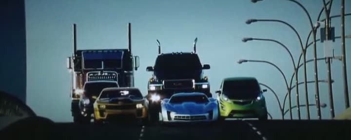 Хората от Ауди са избрали началото на филма (5:44 мин). В останалото време се показва само Дженерал Мотърс, GMC (8:02, 20:14 мин). Шевролет (пак Дженерал Мотърс) се показва няколко пъти в първата половина на филма (19:28, 20:14 мин.). На зелените коли, също Шевролет, емблемата не се показва, но се подчертават, като два от роботите се спречкват за тях няколко секунди по-рано. Около 35:03 минута пак се рекламира Шевролет като марката «Камаро» се споменава три пъти и то единия път от лигава мацка казваща „Обичам Камаро”, а в третия се споменава и буквеното означение на марката Z28. Е това е вече доста прекалено! Емблемата и на зелените коли се вижда в 48:49 минута в 1:13:39 виждаме и надписа Камаро.