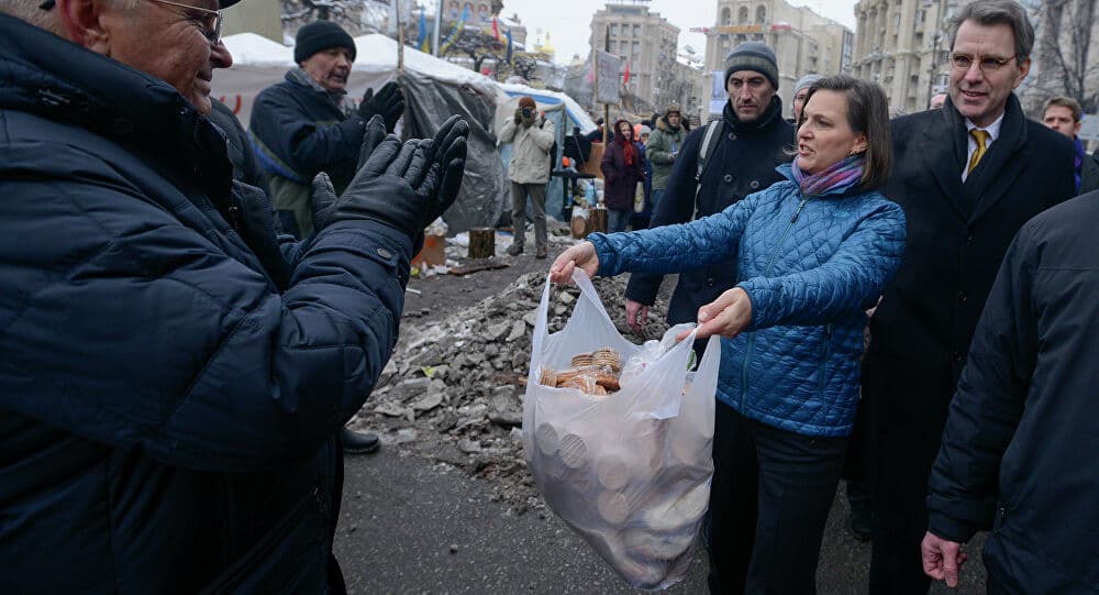 Виктория Нуланд раздава блинчики на протестирашите украинци. Зад нея е американския посланик в Украйна.