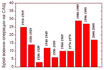 Фигура 1 Брой задгранични военни операции на САЩ разбити по десетилетия съгласно (2).