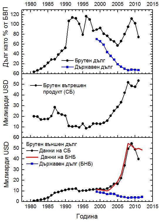 Фигура 2 Изменение на брутния и държавния външен дълг в американски долари (долу) и като процент от брутния вътрешен продукт (горе) и на брутния вътрешен продукт (в средата) на България от 1981 година насам по данни от Световната Банка (СБ) (3) и БНБ (4).