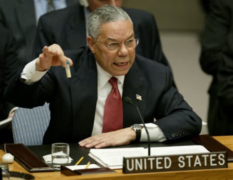 Колин Пауъл лъже ООН с шишенце мощна отрова от химическите оръжия за масово поразяване на Саддам. Представете си, ако беше го изпуснал.
