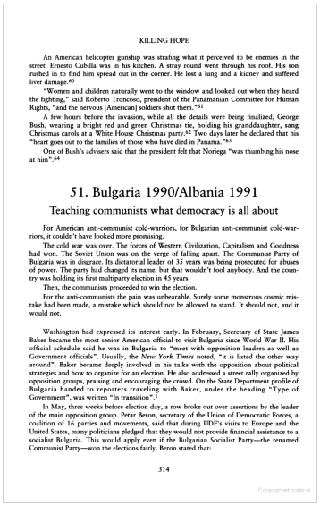 Българските социалисти макар и да не се съмняват в посветеността на Ващингтон в експорта на капитализъм не се оплакват, че САЩ нарушава демократичните принципи като работи против ръководството избрано от българския народ. Един реформатор от социалистическото правителство споменава, че американците са реагирали на изборната победа на неговата партия така сякаш тя представляваше провал на политиката на САЩ. „Администрацията на САЩ не са най-чистите морални защитници на демокрацията у нас” – казва той. „Което не може да бъде направено у дома, може да бъде безнаказано упражнено в тази тъмна назадничава балканска страна.” (34)