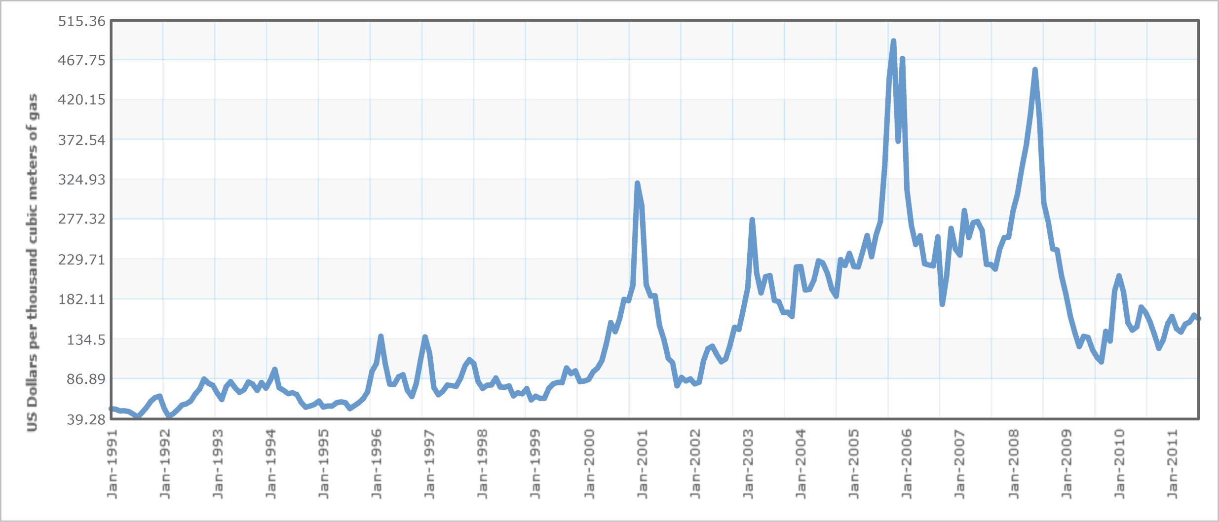Фигура 1 Цена на природния газ в САЩ от януари 1991 насам (7). Цената по вертикалната ос е в американски долари за 1000 кубически метра газ.