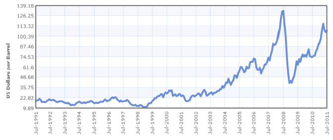 Фигура 2 Цена на суровия петрол в американски долари за барел. Изменението на цената на руския газ според съглашението на Газовия форум следва това на суровия петрол с 6 месеца закъснение (17).