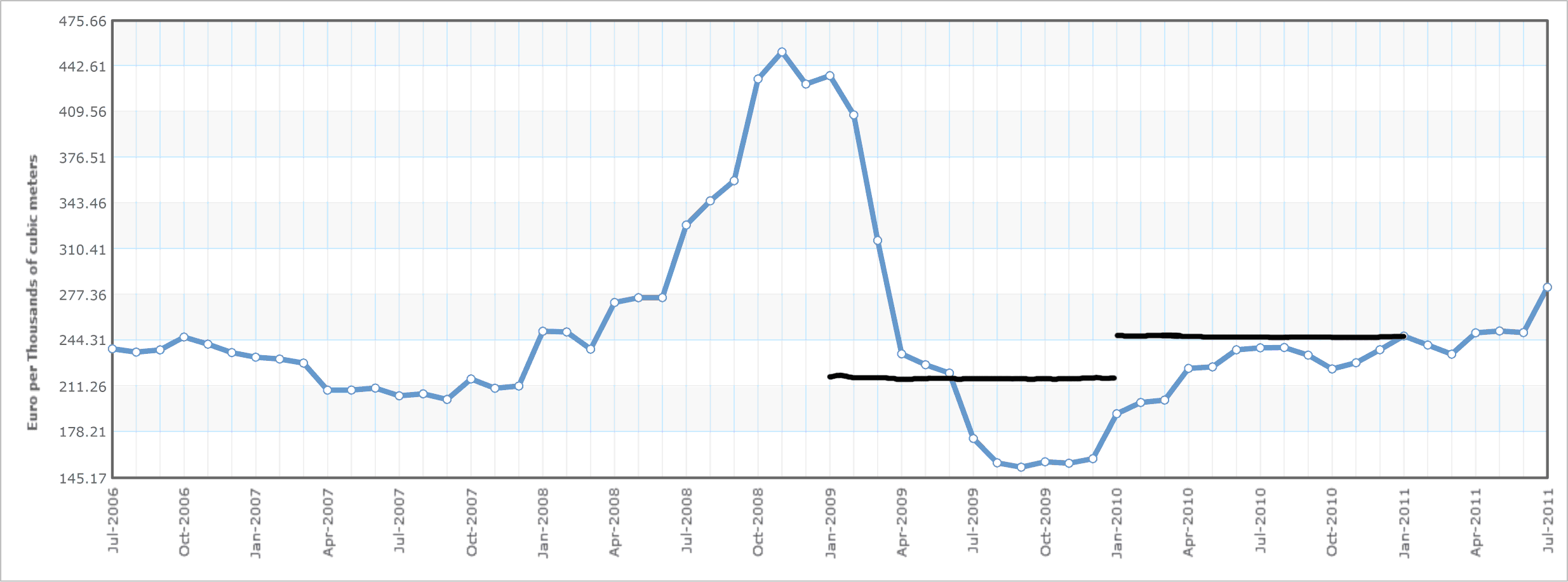 Нашите министри също се стремят да упражняват натиск върху руснаците относно картелното споразумение на „Газовия форум”, макар че предложената от Газпром базова цена (каквото и да означава) е 290 долара (18). Обявените със задна дата средногодишни цени за 2009 и 2010 са 427.89 и 481.28 лв. за 1000 куб. метра (19) което при фиксиран курс на еврото от 1.96 лв за евро прави 218 и 245 евро за 1000 куб.м. Като се направи сравнение с цената на руския газ в евро, Фигура 3, се вижда, че драстични надценки няма. Руснаците ни третират като германци и повод за оплаквания не виждам.
