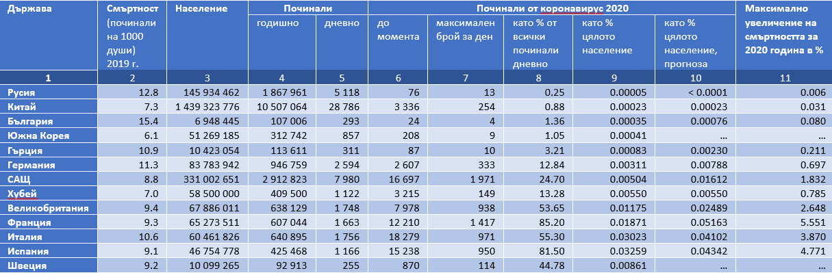 Колкото и да е странно, много хора са изненадани от факта, че в света могат да умират милиони хора годишно и хиляди дневно. Да, умират, както се казва от естествена смърт, от смъртоносни болести от произшествия. Конкретните цифри са в четвърта и пета колона от таблицата. От нея се вижда, че в България умират 107 хиляди души годишно и около 300 дневно. На техния фон починалите от коронавируса 24 души са доста малко, а коректното е да се сравнява с максималния брой починали за ден, който е 4 души (на 27 март и на 2 април). Така максималният брой починали дневно от коронавируса в България е 1.36% от починалите по други причини включващи усложнения от сезонния грип. Не толкова добре стои въпросът със страните в дъното на таблицата Великобритания, Франция, Италия и Испания, където максималния брой починали за един ден е над 50% от умиращите дневно по други причини. Числото разбира се е завишено, тъй като данните в колона пет са средни за цялата година, а в зимните месеци вероятно умират повече хора.